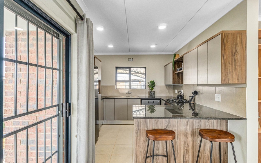 The bright and airy living room seamlessly connects to the dining area, which opens onto a covered braai space with a charming thatched roof—ideal for summer barbecues and memorable family gatherings.