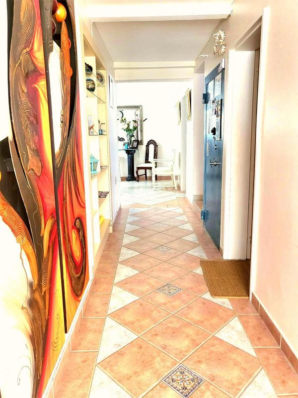 This special designed house consists at ground level of an entrance hall that leads to the dining room, lounge/TV room, lovely sun room, two spacious bedrooms, guest toilet, bathroom with shower and basin, pantry as well as a kitchen with scullery, open trusses in bedrooms and lounge; up with a staircase on first level the house furthermore consists of a lounge/TV room area and built-in-braai room with lovely arched walls, very spacious main bedroom with lovely full bathroom; at second level a spacious bedroom with arched walls and a slight sea view. Huge double garage with space for caravan or boat, at the back of the yard a courtyard, a workplace/ toolshed and outside toilet.