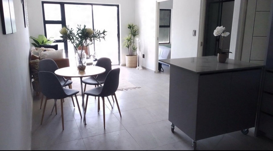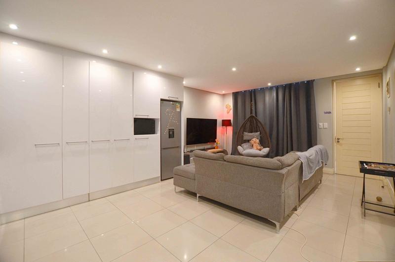 The entrance leads into an expansive, light-filled living area designed for seamless flow between the kitchen, dining, and lounge spaces. Sliding doors open to a large, covered patio with a built-in braai, overlooking a spacious, yet well-maintainable garden — perfect for laid-back weekends and effortless entertaining.
