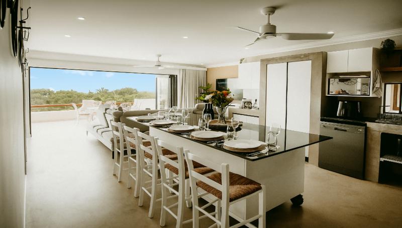 The apartment offers three spacious bedrooms and two bathrooms, designed for comfort with built-in storage and plenty of natural light. The open-plan lounge, dining area, and fully fitted kitchen flow seamlessly to a covered balcony and sun terrace, creating an ideal setting for entertaining or quiet evenings by the ocean.