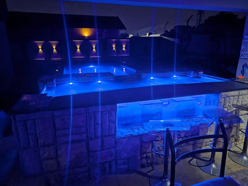 The under-roof entertainment area boasts a built-in gas and traditional braai, water feature, and a bar pool with seating, alongside a sparkling swimming pool – perfect for hosting friends and family.