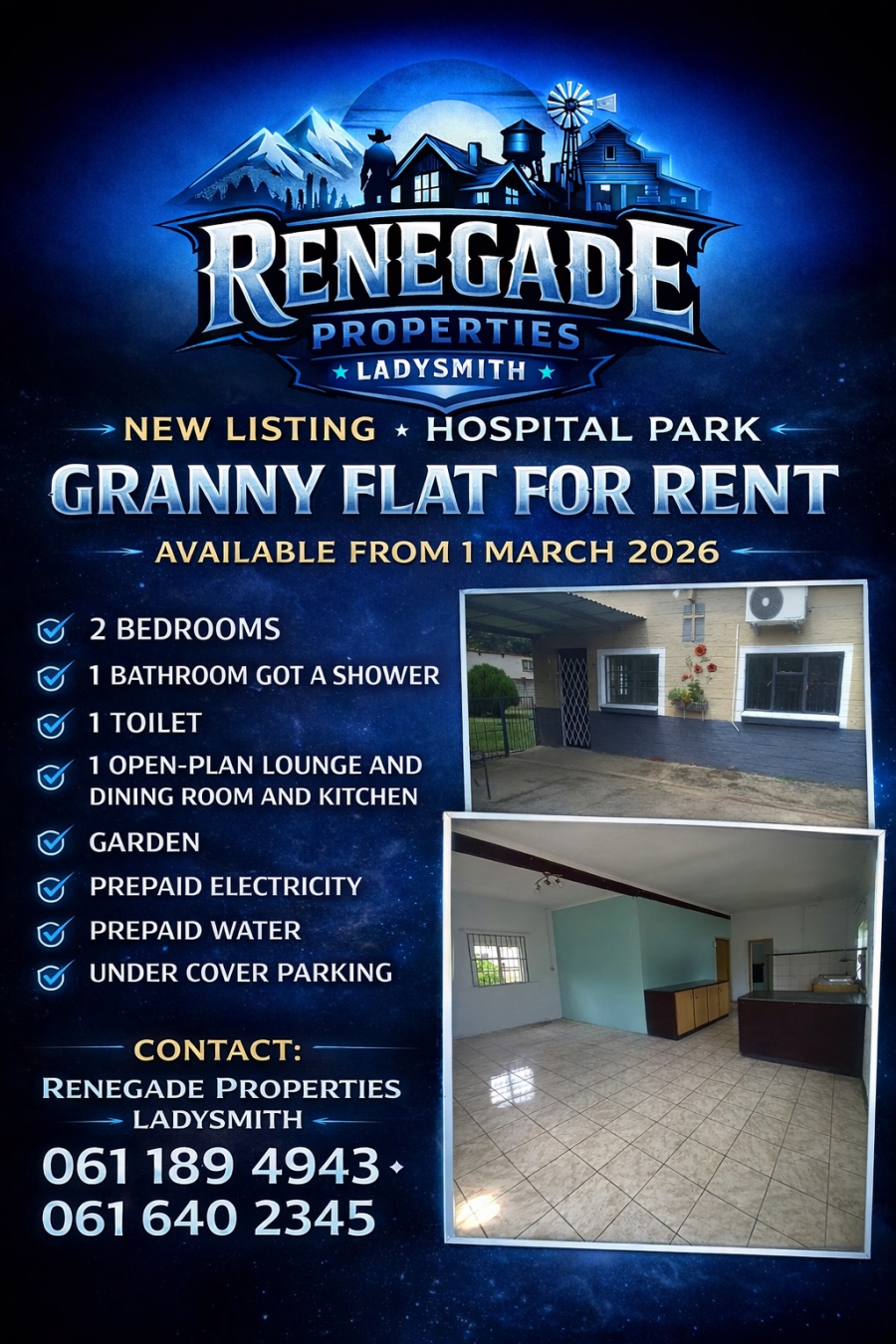RENEGADE PROPERTIES LADYSMITH NEW LISTING HOSPITAL PARK GRANNY FLAT FOR RENT AVAILABLE FROM 1 MARCH ...